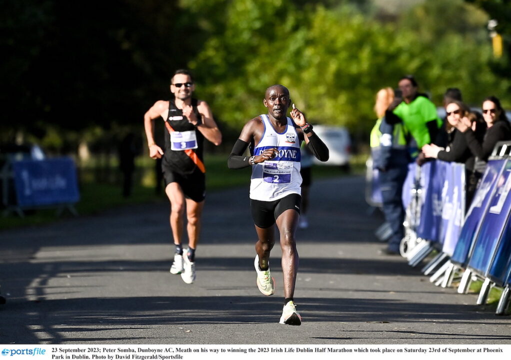 Peter Somba of Dunboyne AC was the winner of Dublin Half Marathon, held in the Phoenix Park on Saturday after a Battle Royale with Sergiu Ciobanu of Clonliffe Harriers. Just a second separated the pair on the finish line with Somba timed at 67 mins 5 secs and Ciobanu at 67:06. Third in 67:08 was David Glynn.